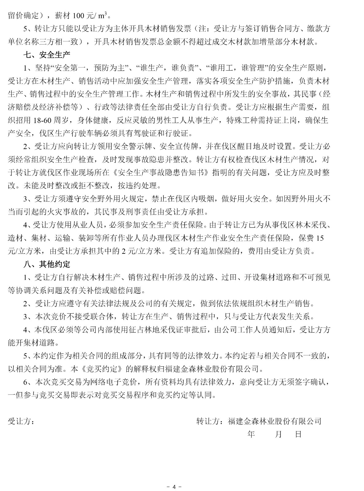 3. 交易成交,在收到交易雙方出具的《款項收訖及正式書面合同簽訂確認函》后的5個工作日內,受讓方已交納的交易保證金由交易中心直接轉到福建金森林業股份有限公司指定銀行賬戶充抵履約保證金。