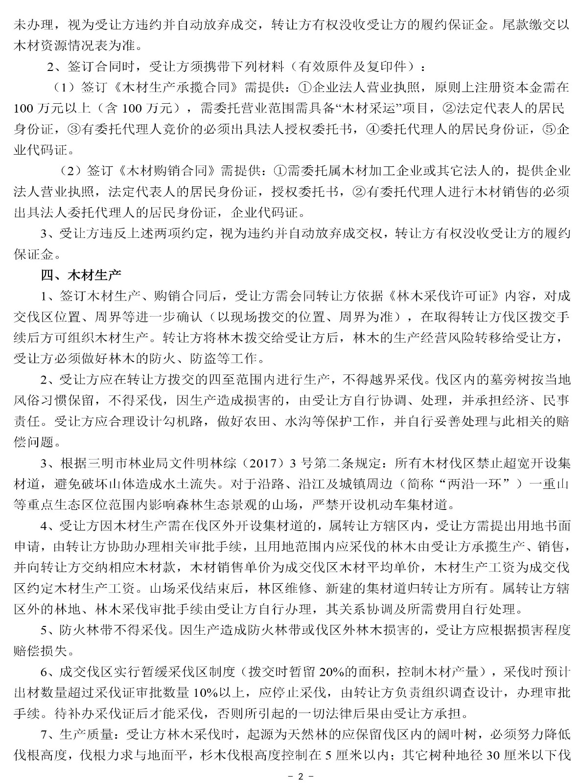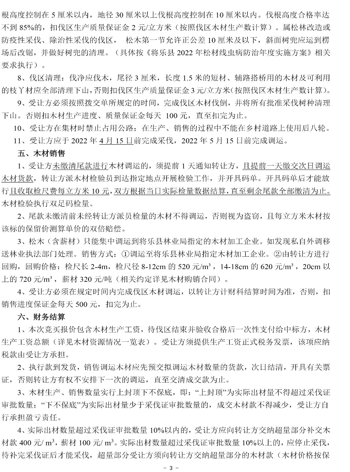 2本次競買報價包含木材生產工資,木材生產工資總額詳見木材資源情況一覽表,待伐區結束并驗收后一次性支付給受讓方。